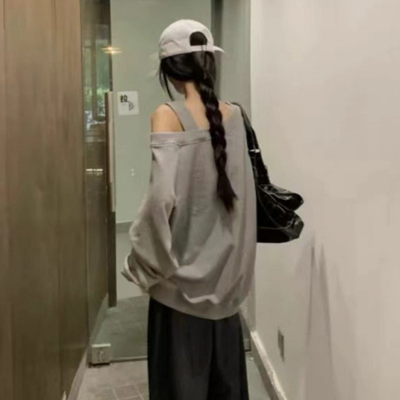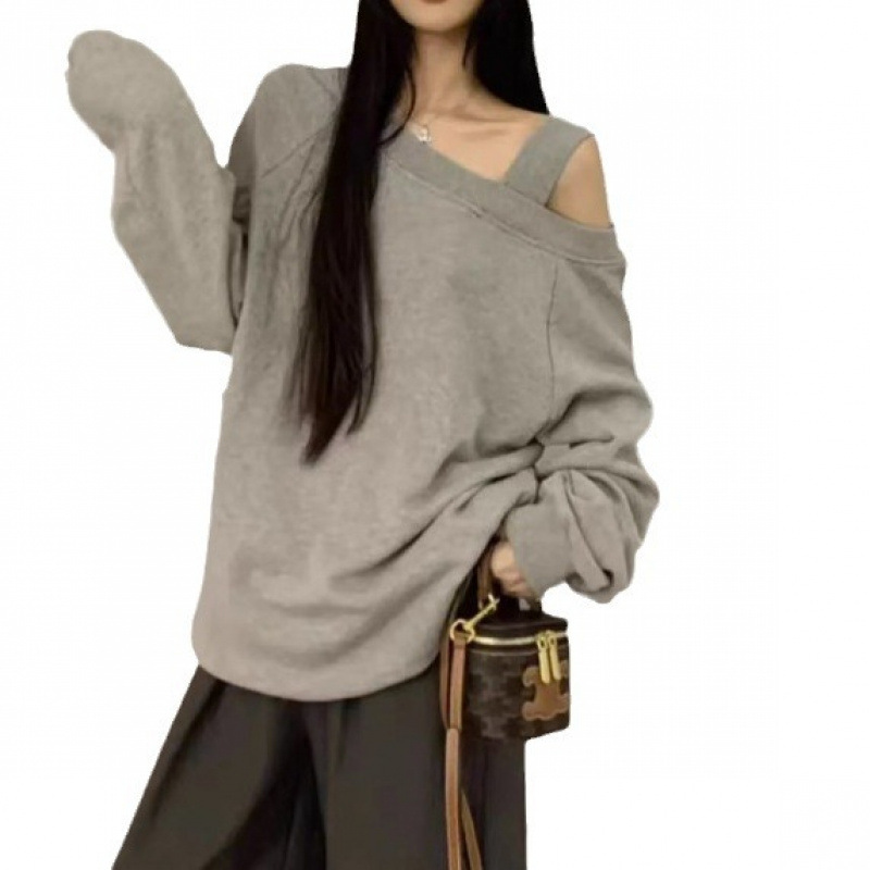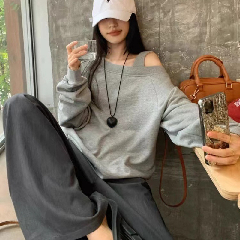 個性的な肩開きデザインが魅力的なこちらのスウェットは、グレーファッションの定番アイテムとして活躍します。