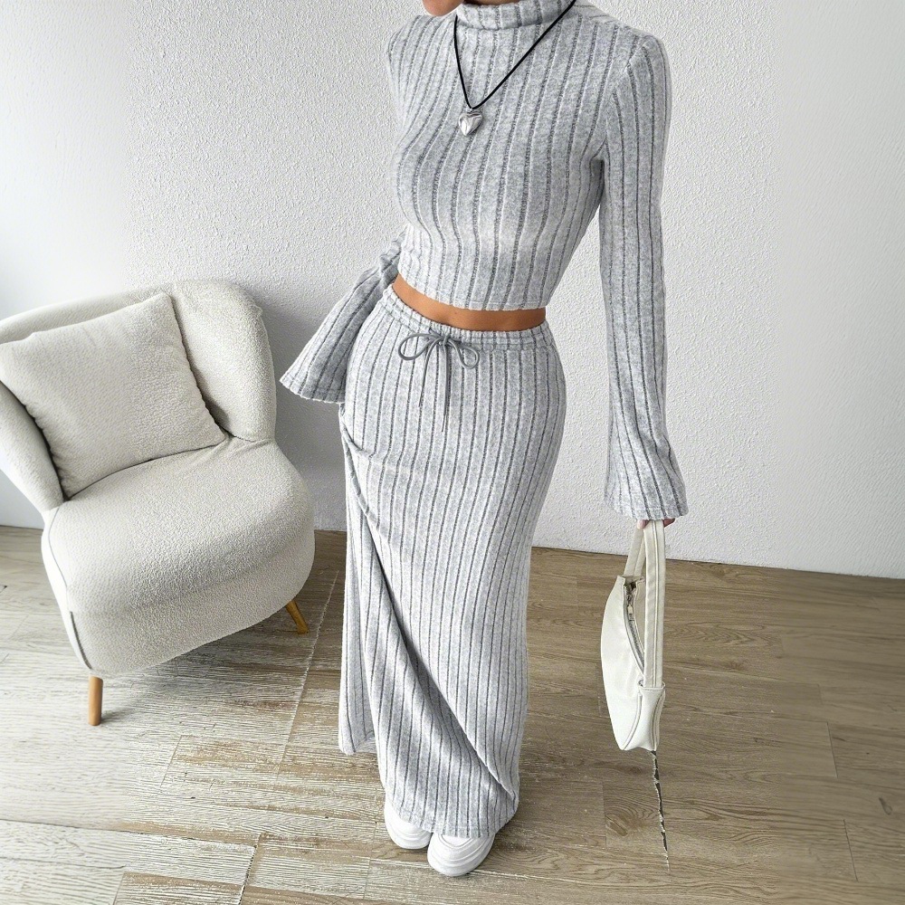 縦のリブ編みが美しいショート丈のトップスと、ゆったりとしたロングスカートの組み合わせが女性らしいシルエットを演出します。
