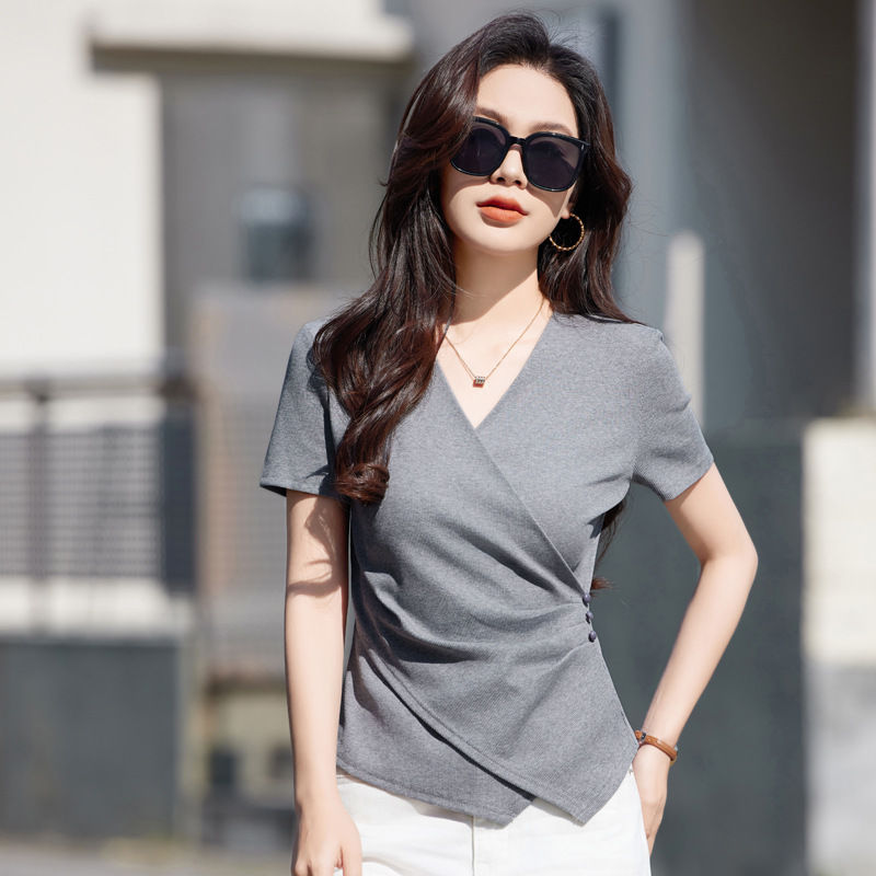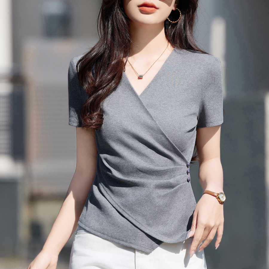 胸元を美しく見せるカシュクール風のラップデザインが特徴で、さりげないサイドのボタン装飾がアクセントになっています。