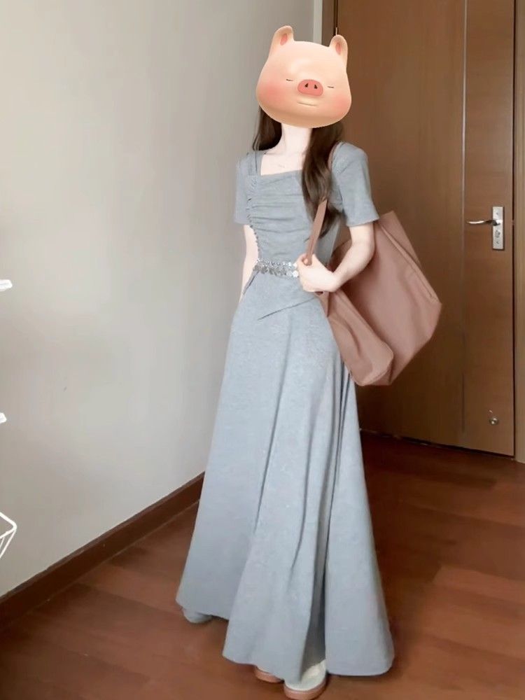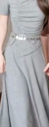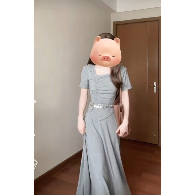 上品なギャザーデザインの半袖トップスと、流れるようなロングスカートの組み合わせが特徴的です。