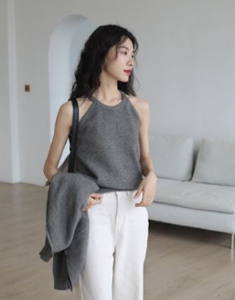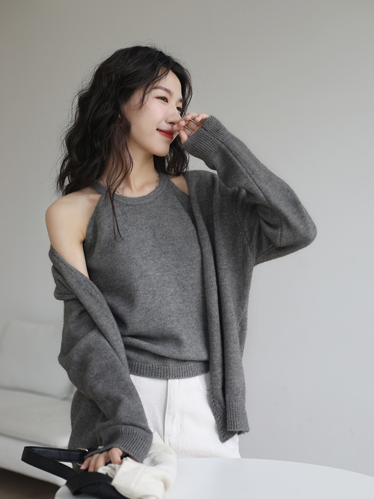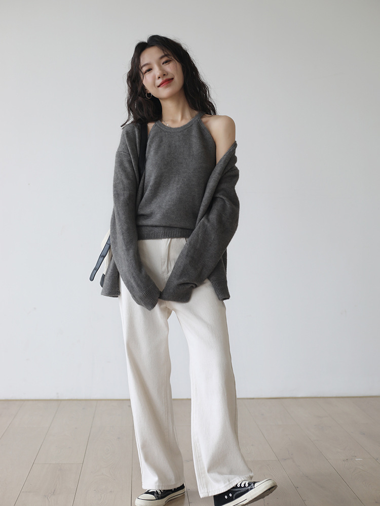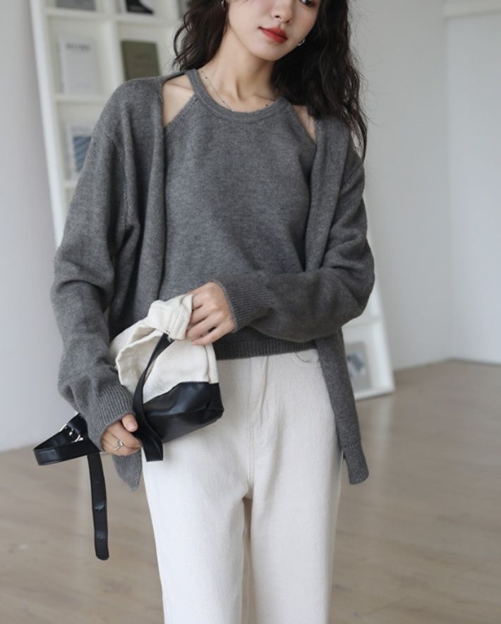 肩が開いたデザインのインナートップスとゆったりとしたカーディガン、ベーシックなニットの組み合わせで、着回し力抜群のアイテムです。