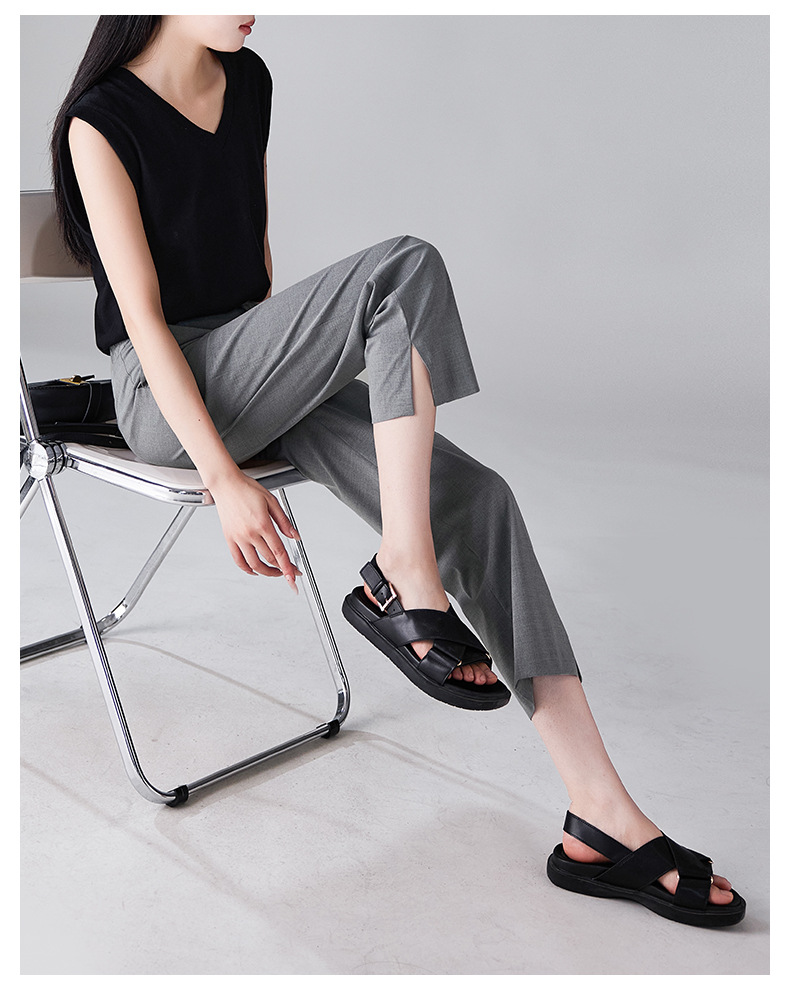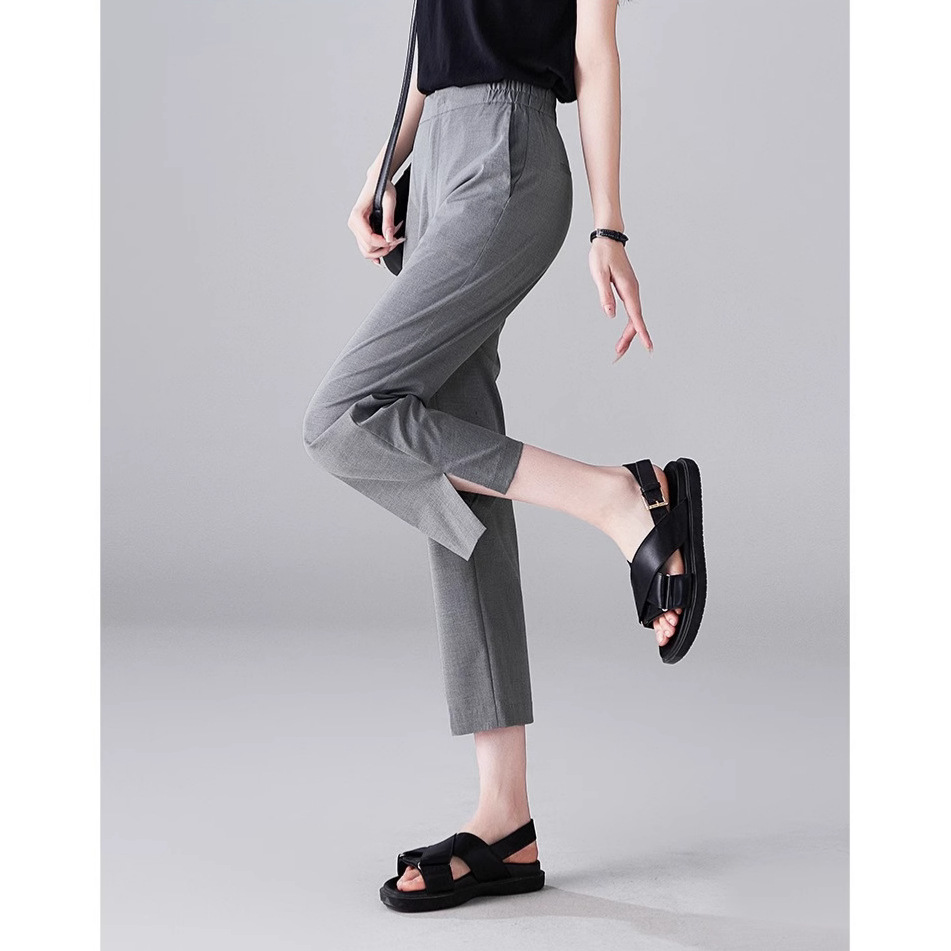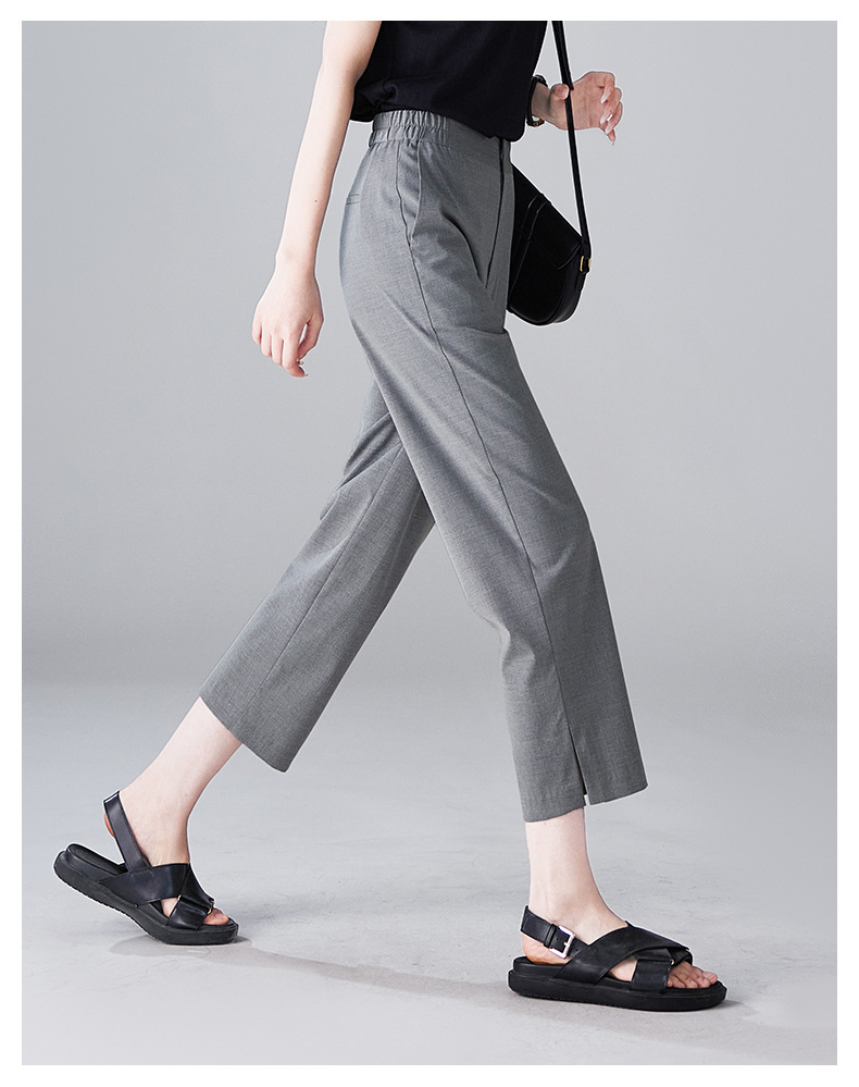 九分丈のすっきりとした裾のデザインが足元を軽やかに見せ、サンダルとの相性も抜群です。